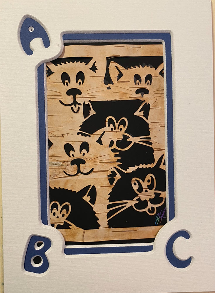 The card is made of natural birch bark. Very positive company of cats. Each copy is individual and handmade with the original signature of the artist. The card is made using the appliqué technique. The pcard has a passe-partout and can be framed like a painting.